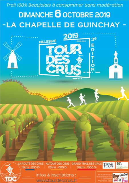 - "Autour Des Crus" : un Trail de 23 km pour 600 D+ au milieu des somptueux paysages viticoles, et arpentant les sommets des Crus Chénas, Juliénas avec un finish au milieu des vignes du Cru Moulin-à-vent (départ à 9h15)