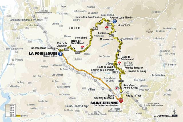 Au programme : 18,4 km avec une première montée sur Saint-Héand, une descente en direction de L'Étrat, puis une courte ascension pentue en direction de la Tour-en-Jarez. Direction ensuite La Maladière, puis le rond-point Andreï Kivilev, avant une arrivée devant le stade Geoffroy-Guichard.