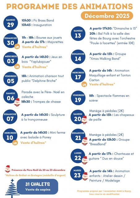 Découvrez toutes les animations prévues du 29 novembre au 23 décembre 2025 : concerts, spectacles, jeux pour enfants, mini-ferme, parade du Père Noël, bal folk, maquillage, vente d'huîtres, bourse aux jouets… et bien plus encore !