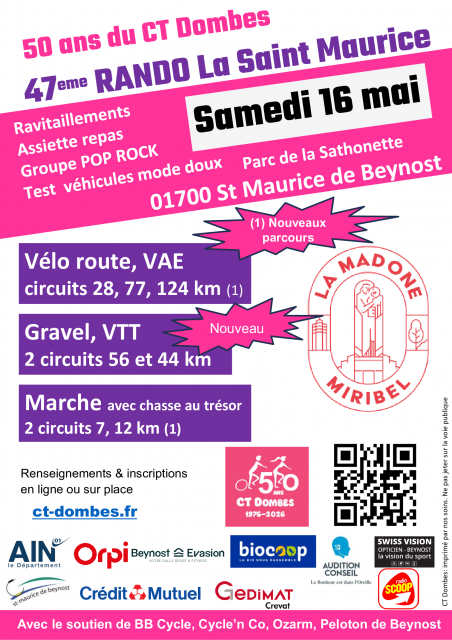 A l'occasion des 50 ans du club, les « Roses » du CT Dombes de St Maurice de Beynost ont le plaisir de vous proposer une édition spéciale de leur randonnée Cyclo & Pédestre avec cette année de nombreuses Nouveautés à Rando pédestre & cyclo LA SAINT MAURICE.