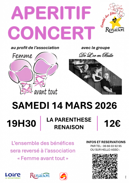 Le Comité des Fêtes de Renaison vous invite à un Apéritif-Concert Solidaire exceptionnel. Alliez le plaisir des oreilles à la générosité : l'intégralité des bénéfices sera reversée à l'association « Femme avant tout » pour soutenir son action auprès des femmes.