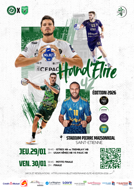 Le Hand Élite 42, le tournoi des 4 valeurs au Stadium Pierre Maisonnial de Saint-Etienne pour vivre l'expérience du haut niveau à Saint-Étienne alors rejoignez-nous pour deux soirées exceptionnelles les 29 et 30 janvier 2026.