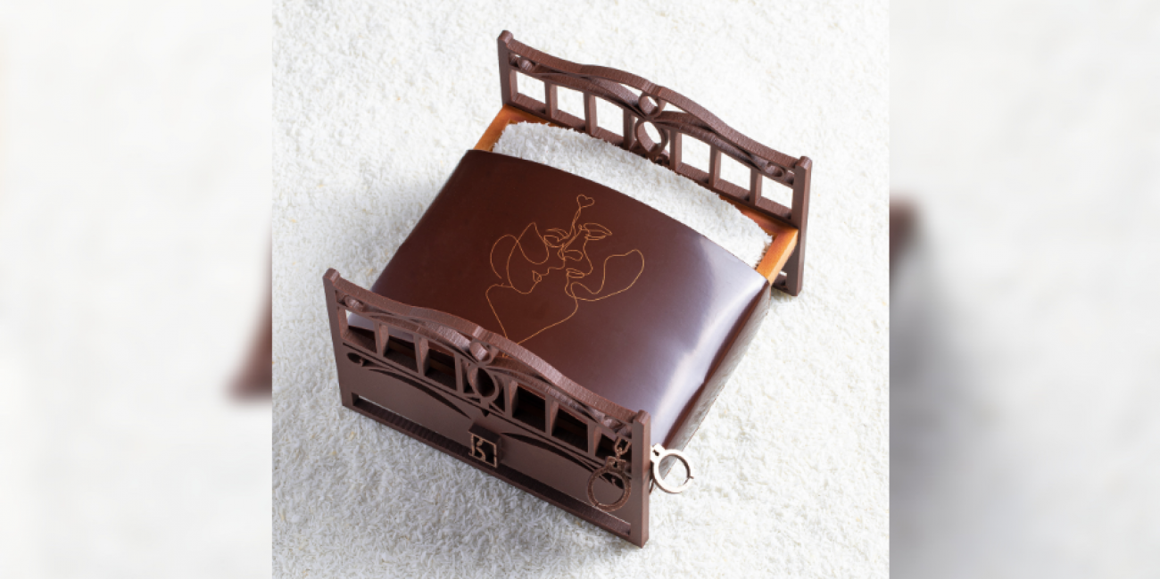 Finement ciselé en chocolat, le lit cache "un gâteau en forme de cœur alliant vanille, pécan, caramel", décrit l'artiste qui promet aux amoureux d'une nuit (ou d'une vie) de la "douceur et gourmandise pour un moment sucré".