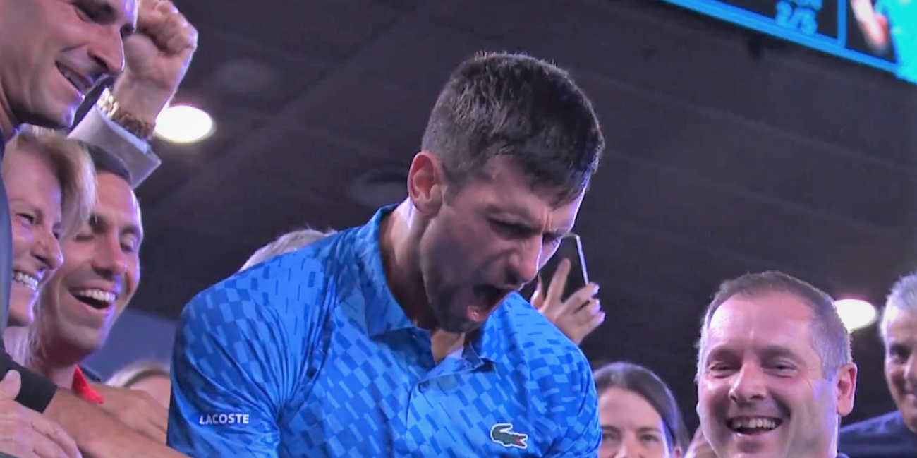 Une fois la victoire assurée sur une ultime faute de son adversaire, Novak Djokovic est monté dans son box embrasser son équipe dont son coach Goran Ivanisevic et sa mère Dijana et s'y est effondré en sanglots.