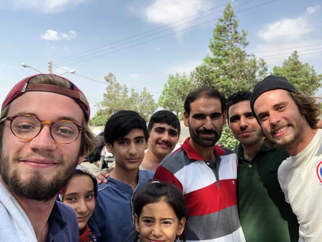 | Benjamin (à gauche) et Augustin (à droite) avec une famille rencontrée en Iran © DR |