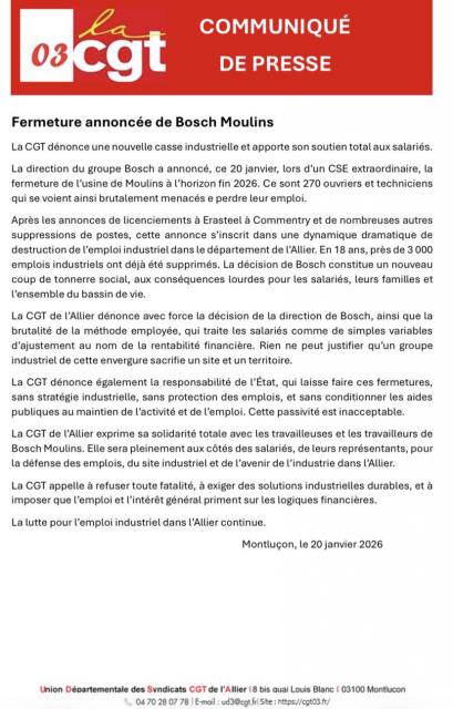 | Le communiqué de la CGT 03 après l'annonce de la fermeture de Bosch |