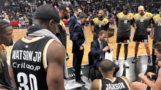 | Pierric Poupet expliquant les consignes tactiques à ses joueurs pendant un temps mort. © Radio SCOOP - Tom Bonnard |
