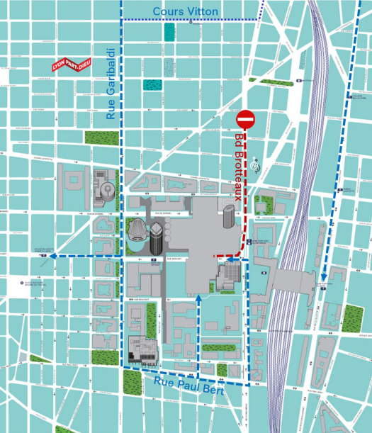 Pendant le chantier, les conducteurs ont encore la possibilité de tourner à gauche rue Servient depuis le boulevard Vivier-Merle. La sortie du parking Oxygène est, elle, déviée sur la rue de Bonnel.