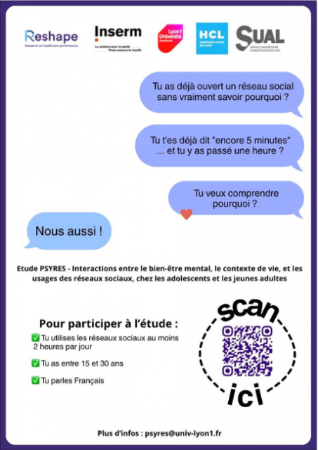 L'étude PSYRES vise à mieux comprendre les interactions entre le bien-être mental, le contexte de vie et les usages des réseaux sociaux chez les adolescents et les jeunes adultes.