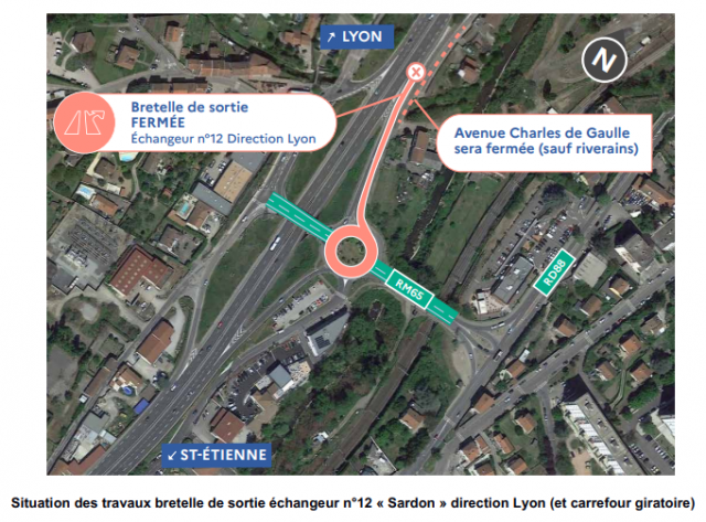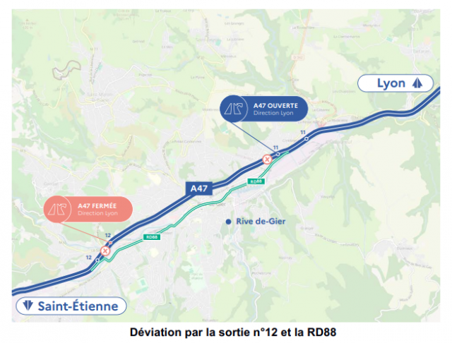 Lors des coupures de nuit de l'autoroute, les usagers devront sortir à l'échangeur n°12 dans le sens Saint-Étienne / Lyon, rejoindre la RM88, puis se réinsérer sur l'A47 par la bretelle d'entrée de l'échangeur n°11.