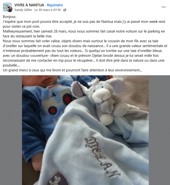 "Si quelqu'un tombe sur une taie d'oreiller bleue, avec un doudou-couverture- chien cousu et le prénom Djelan brodé dessus je lui serais mille fois reconnaissant de me contacter pour le récupérer."
