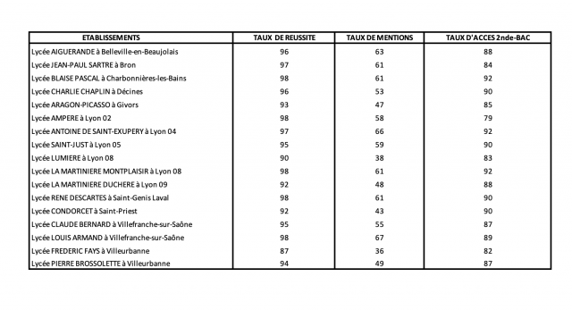 Seuls deux lycées ont un taux de réussite inférieur à 90%, Frédéric Faÿs à Villeurbanne et Jacques Brel à Vénissieux.