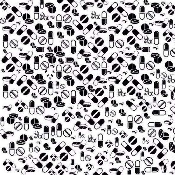 Playbuzz, différents dessins en noir et blanc formant des médicaments et des gélules. Au milieu de toutes ses formes se cache donc un