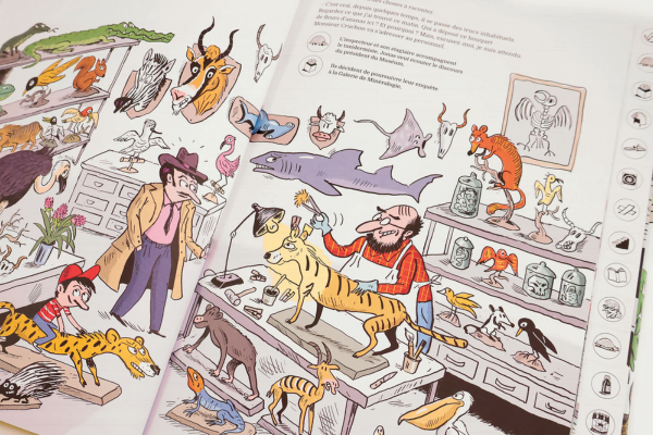 On retrouve des défenses de mammouth sur un dinosaure, un oiseau s'est volatilisé... Il faut donc mener l'enquête dans les différentes salles d'exposition et c'est le lecteur lui-même qui va orienter l'enquête.